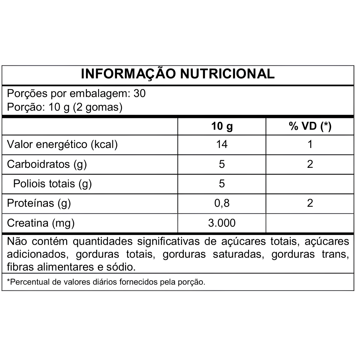 Suplemento alimentar em pastilhas de goma com creatina monohidratada. Embalagem com 60 gomas de 5 g (total 300 g). Sabores: Maçã Verde e Tangerina. Zero adição de açúcares e não contém glúten.
